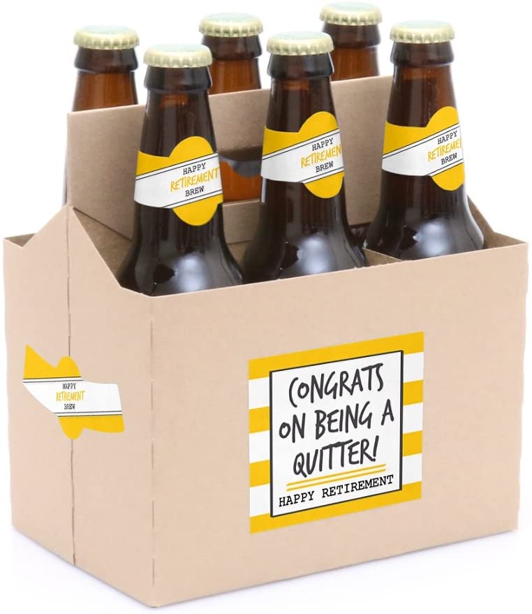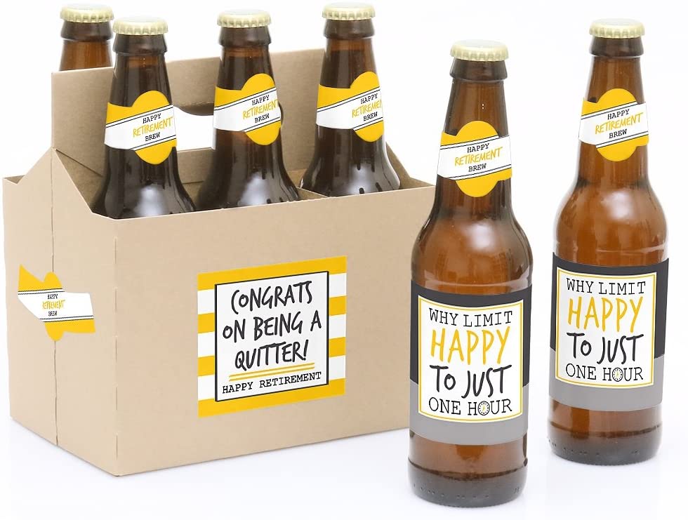 退休派对啤酒礼品套装包括 6 个啤酒瓶贴纸标签和 6 个瓶颈标签(黑色和黄色退休主题),以及 1 个六包装手提袋,内含 4 个退休派对贴纸用于装饰。