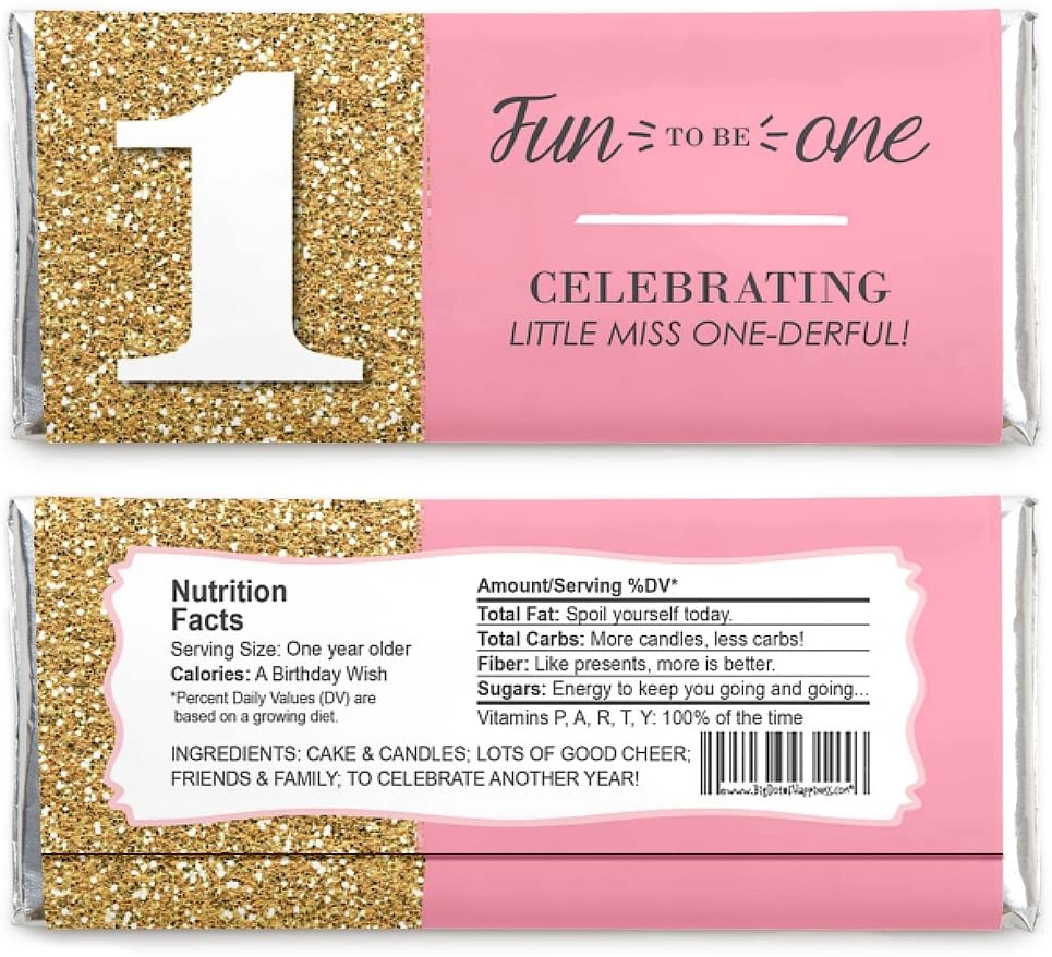 1 岁生日女孩 - 一岁生日乐趣标准糖果棒包装套装包括 24 个巧克力棒包装纸和 24 个箔纸,非常适合打造可爱的粉色和金色糖果自助餐或独特的 1 岁生日女孩派对礼物。