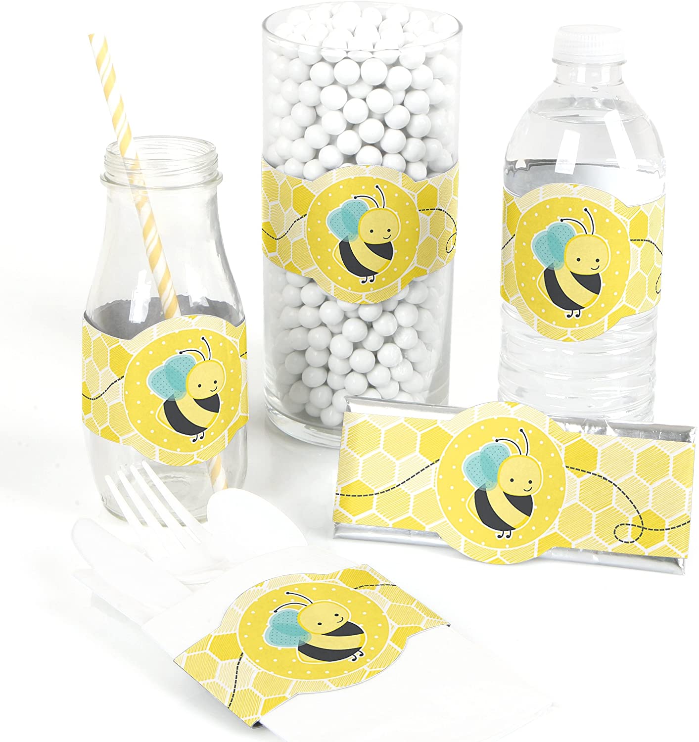 轻松派对装饰:蜜蜂DIY迎婴派对或生日派对包装纸,轻松打造协调一致的派对风格。用这些有趣的包装纸包裹糖果棒、零食盒和零食袋。它们还可以作为可爱的蜜蜂桌面装饰,用于包裹糖果自助餐台和餐桌中心装饰容器中的药瓶。或者,将它们用作饮料标签和餐巾环,轻松打造蜜蜂主题的派对装饰!
