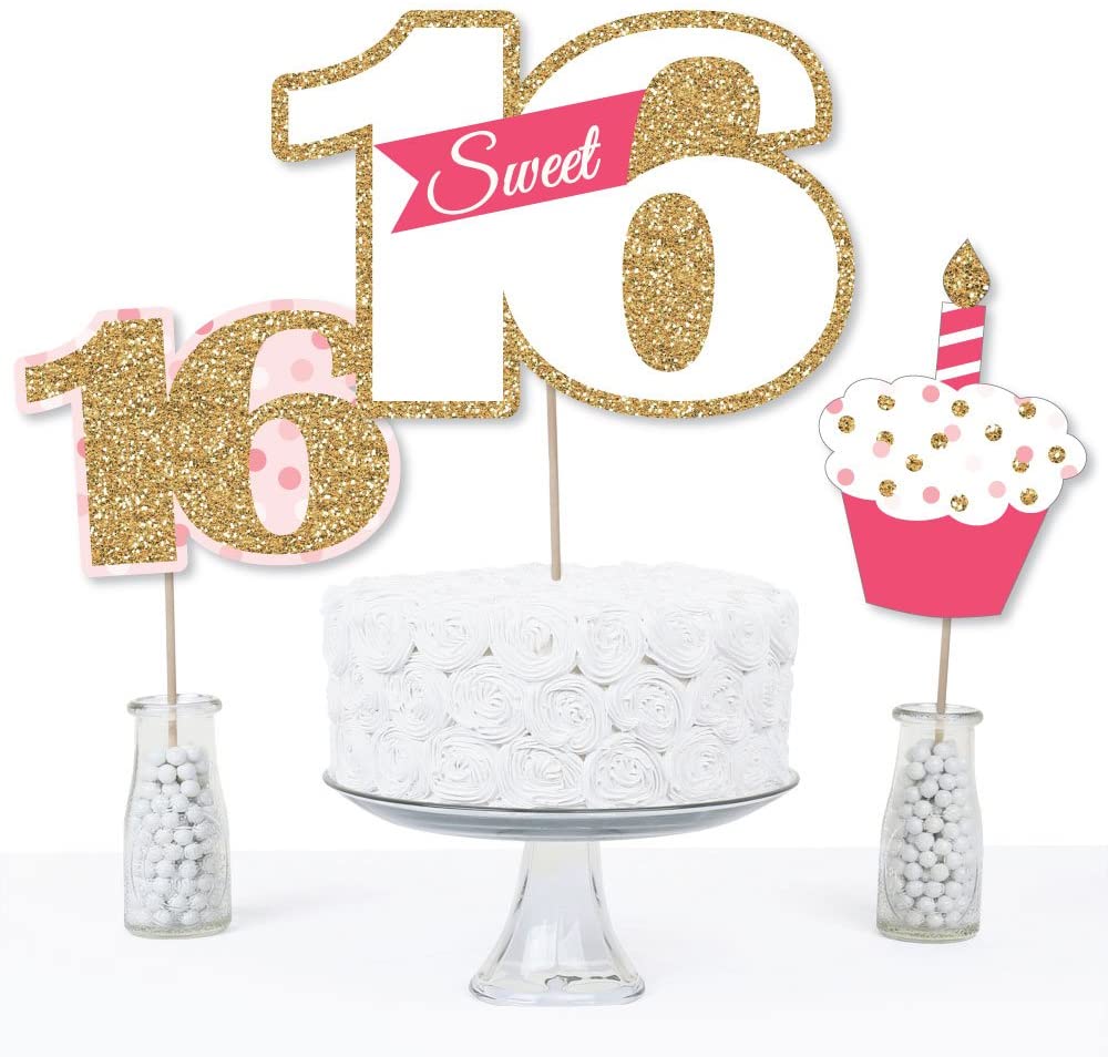 甜蜜16岁 - 16岁生日派对中心装饰棒,尺寸:五个“甜蜜16”主题桌面装饰,10.75英寸宽 x 7.5英寸高;五个“纸杯蛋糕”主题桌面装饰,5英寸宽 x 7英寸高;以及五个“16”主题桌面装饰,7英寸宽 x 5英寸高。独特的设计和丰富的配件,让这款桌面装饰套装成为任何粉色和金色主题派对的点睛之笔。